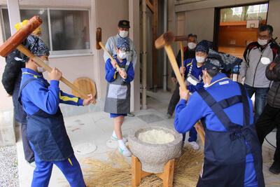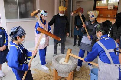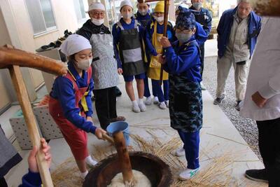 まずはお餅つきの様子です。最初はぎこちなかった子ども達ですが、徐々に上手になっていきました。