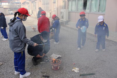 今ではほぼ見かけない「火吹き竹」。もちろんほとんどの子どもが初体験です。