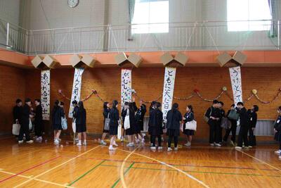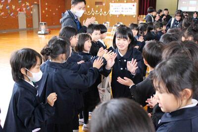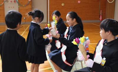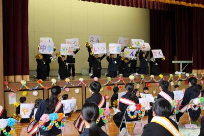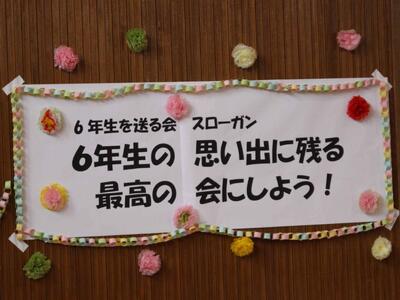 先日、6年生を送り会を開催しました。1年間最高学年として、下級生を引っ張ってくれた6年生に感謝の気持ちを表す会です。今までいろいろな場面でお世話になってきた6年生に喜んでもらうために、各学年とも出し物やプレゼントの準備に頑張って取り組んできました。その6年生を送る会の様子を紹介します。