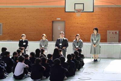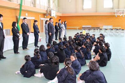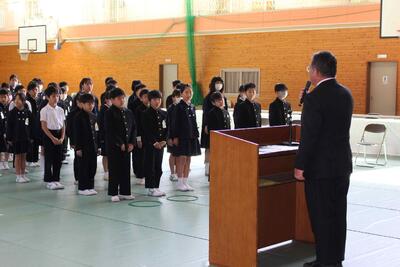 4月8日(水)に着任式並びに令和8年度第1学期始業式を行いました。令和8年度初日は2〜6年生122人が全員出席することができ、本当に嬉しく思いました。着任式で新しい先生5名を迎えた後、始業式では子ども達に「元気」に「目的意識・相手意識」をもって「チャレンジ」し、努力を「継続」しよう、と伝えました。よいスタートを切って、有意義な1年にしていきましょう!(^^)